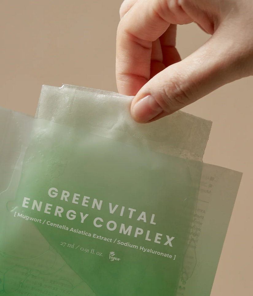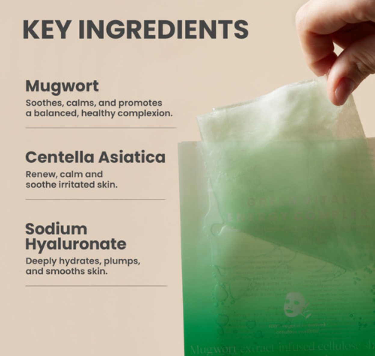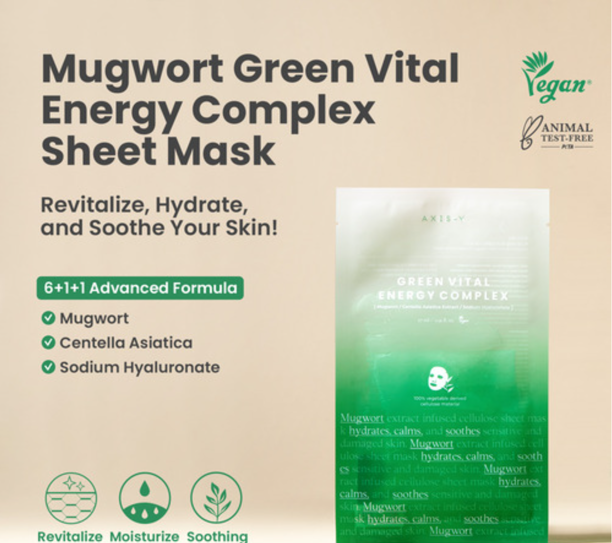 The AXIS-Y Mugwort Green Vital Energy Complex Sheet Mask delivers a powerful dose of hydration and soothing care to tired, irritated skin. Enriched with Mugwort Extract and six green plant-based ingredients, this mask helps calm redness, balance oil and moisture, and revitalize dull skin. The soft cellulose sheet adheres gently to the face, allowing the essence to absorb deeply for smooth, radiant results. Perfect for sensitive or stressed skin in need of a refreshing boost.