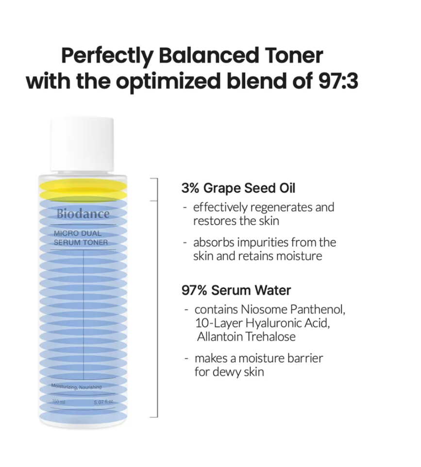 The Biodance Micro Dual Serum Toner is a 2-in-1 hydrating and nourishing toner that combines the refreshing lightness of a toner with the rich care of a serum. Formulated with ceramides, peptides, and hyaluronic acid, it strengthens the skin barrier, boosts elasticity, and locks in moisture for long-lasting hydration. The dual-layer formula instantly absorbs into the skin, leaving it smooth, plump, and radiant without any sticky residue.