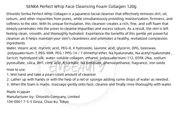 Achieve soft, plump, and youthful-looking skin with Shiseido Senka Perfect Whip Collagen In, a luxurious Japanese facial cleanser infused with collagen and beauty serum. Its signature ultra-fine, dense foam gently removes impurities and excess oil while preserving essential moisture, leaving your skin smooth, firm, and radiant.