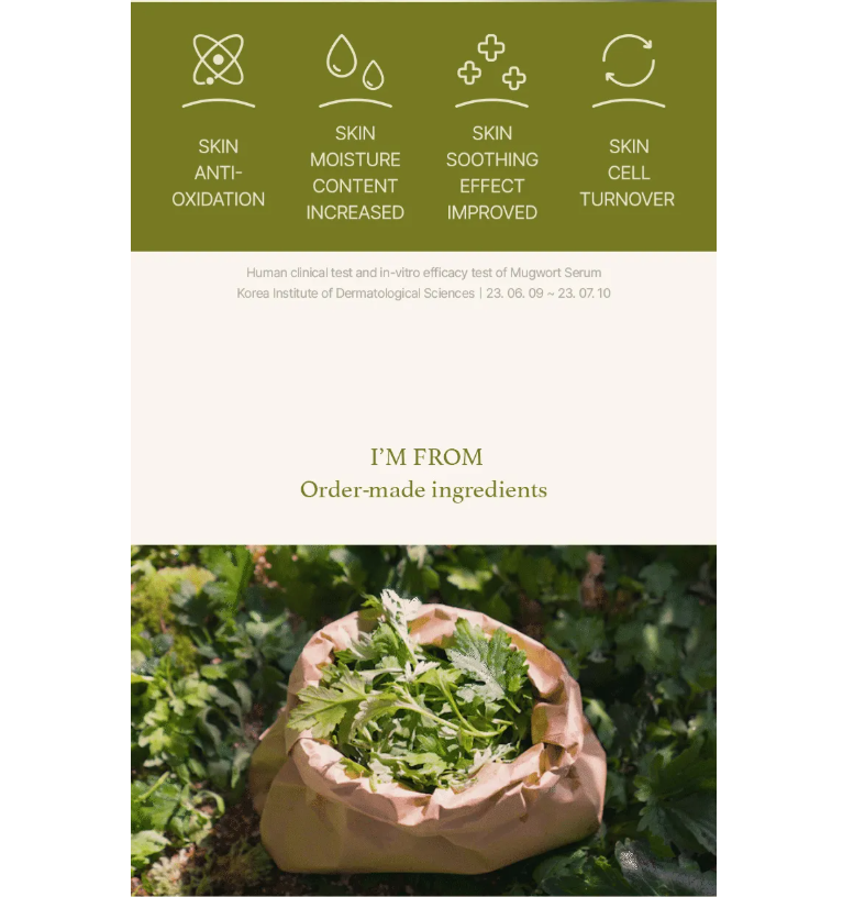 The I’m From Mugwort Serum is a soothing and hydrating serum made with 100% Korean Mugwort Extract to calm irritation, reduce redness, and balance sensitive skin. Its lightweight, watery texture absorbs quickly, delivering instant moisture and relief for tired or stressed skin. Perfect for acne-prone, sensitive, or combination skin, it helps restore a clear, healthy, and glowing complexion.