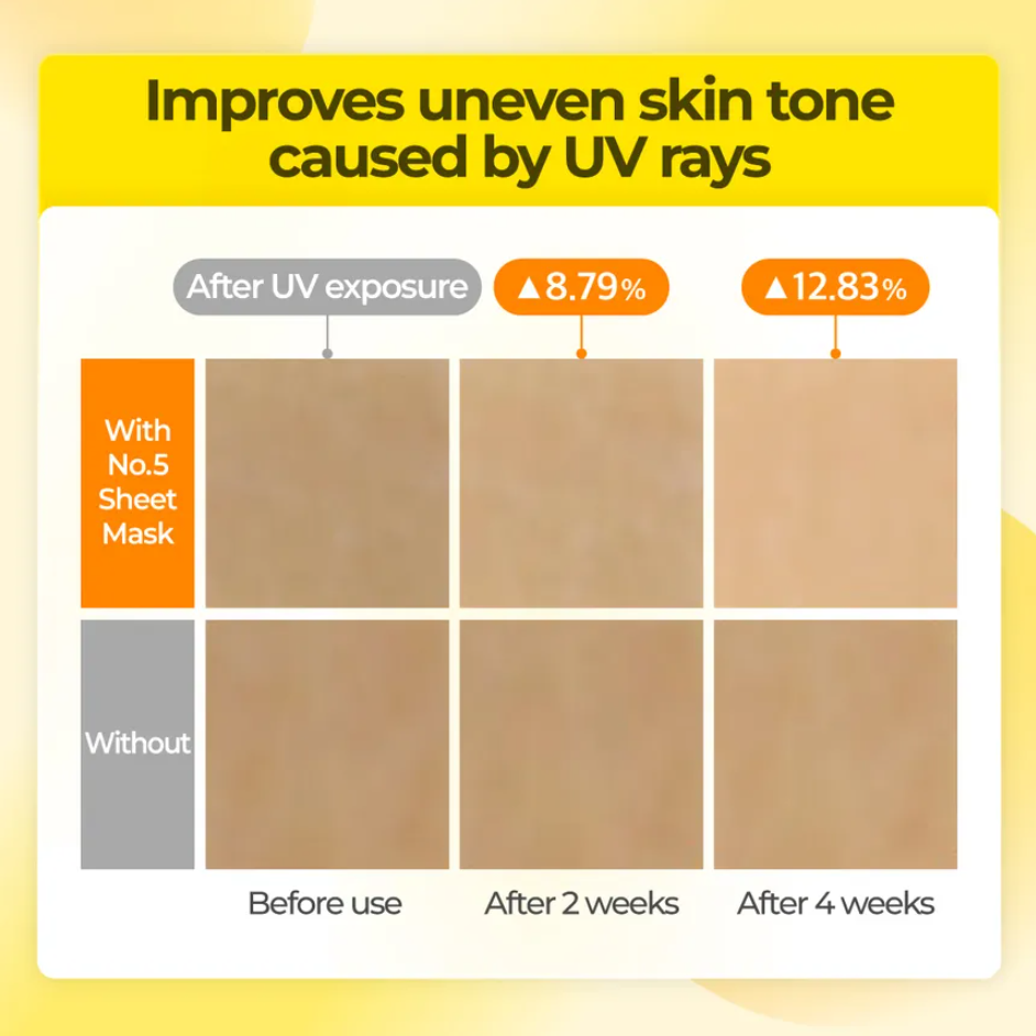 Give your skin an instant glow with the Numbuzin No.5 Glutathione Vitamin Concentrated Mask, a brightening sheet mask packed with Glutathione, Niacinamide, and Vitamin Complex to visibly improve dullness and uneven tone.