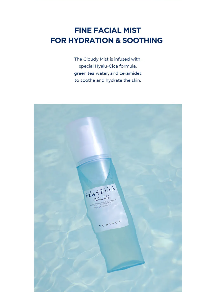 The SKIN1004 Madagascar Centella Hyalu-Cica Cloudy Mist delivers instant hydration and soothing care with every spray. Infused with Centella Asiatica extract from Madagascar and the Hyalu-Cica complex (Hyaluronic Acid + Cica), this ultra-fine mist replenishes moisture, calms irritation, and strengthens the skin barrier. Its lightweight, non-sticky formula absorbs quickly, leaving the skin refreshed, dewy, and balanced. Perfect for use anytime your skin feels dry or sensitive.