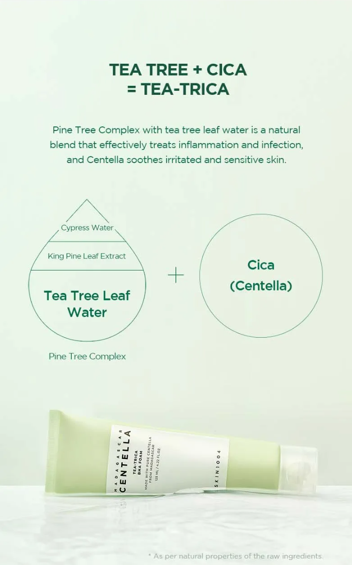 The SKIN1004 Madagascar Centella Tea-Trica BHA Foam is a gentle yet effective cleanser designed to purify pores, control excess oil, and soothe irritated skin. Formulated with Centella Asiatica Extract, Tea Tree Leaf Water, and BHA (Salicylic Acid), it helps remove dead skin cells and impurities while maintaining the skin’s moisture balance. The fine, rich foam cleans deeply without irritation, leaving the skin clear, smooth, and refreshed.