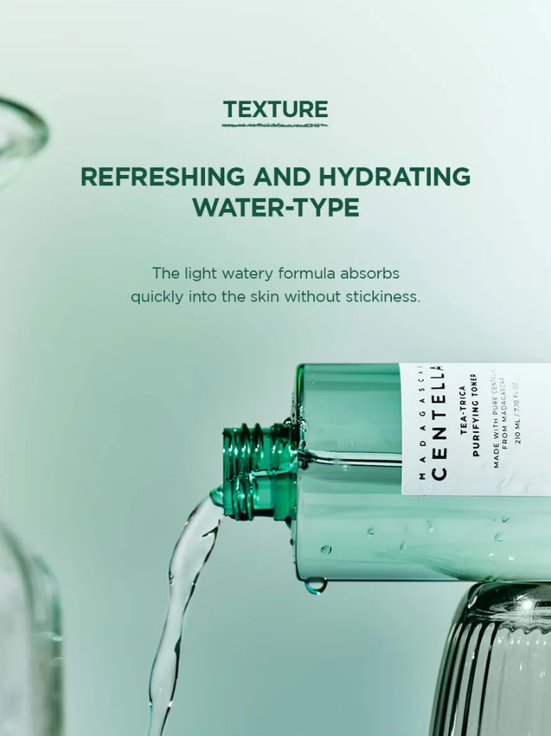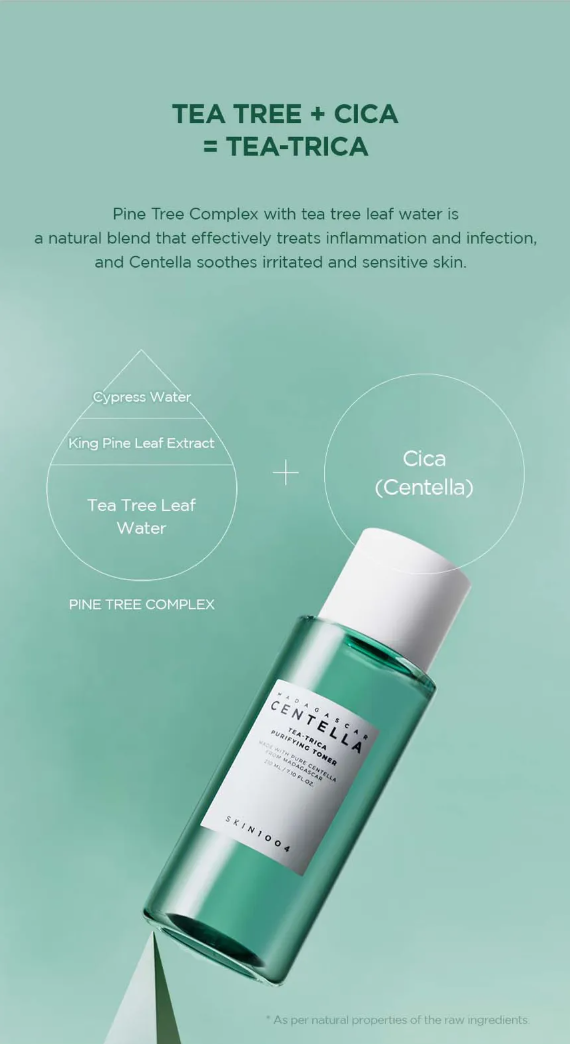 The SKIN1004 Madagascar Centella Tea-Trica Purifying Toner is a refreshing, clarifying toner formulated to balance, soothe, and purify acne-prone and oily skin. Enriched with Centella Asiatica Extract and Tea Tree Leaf Water, it helps calm irritation, control excess sebum, and gently remove impurities while maintaining the skin’s natural moisture balance. The lightweight formula leaves the skin feeling clean, refreshed, and visibly clearer.