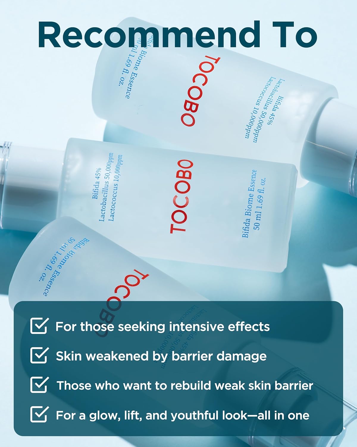 The TOCOBO Bifida Biome Essence is a lightweight, deeply hydrating essence formulated with Bifida ferment lysate and probiotics to strengthen the skin barrier and improve resilience. It helps balance the skin’s microbiome, reduce sensitivity, and enhance elasticity for a healthier, more radiant complexion. With its smooth, fast-absorbing texture, this essence delivers long-lasting hydration without stickiness, making it suitable for all skin types, including sensitive skin.