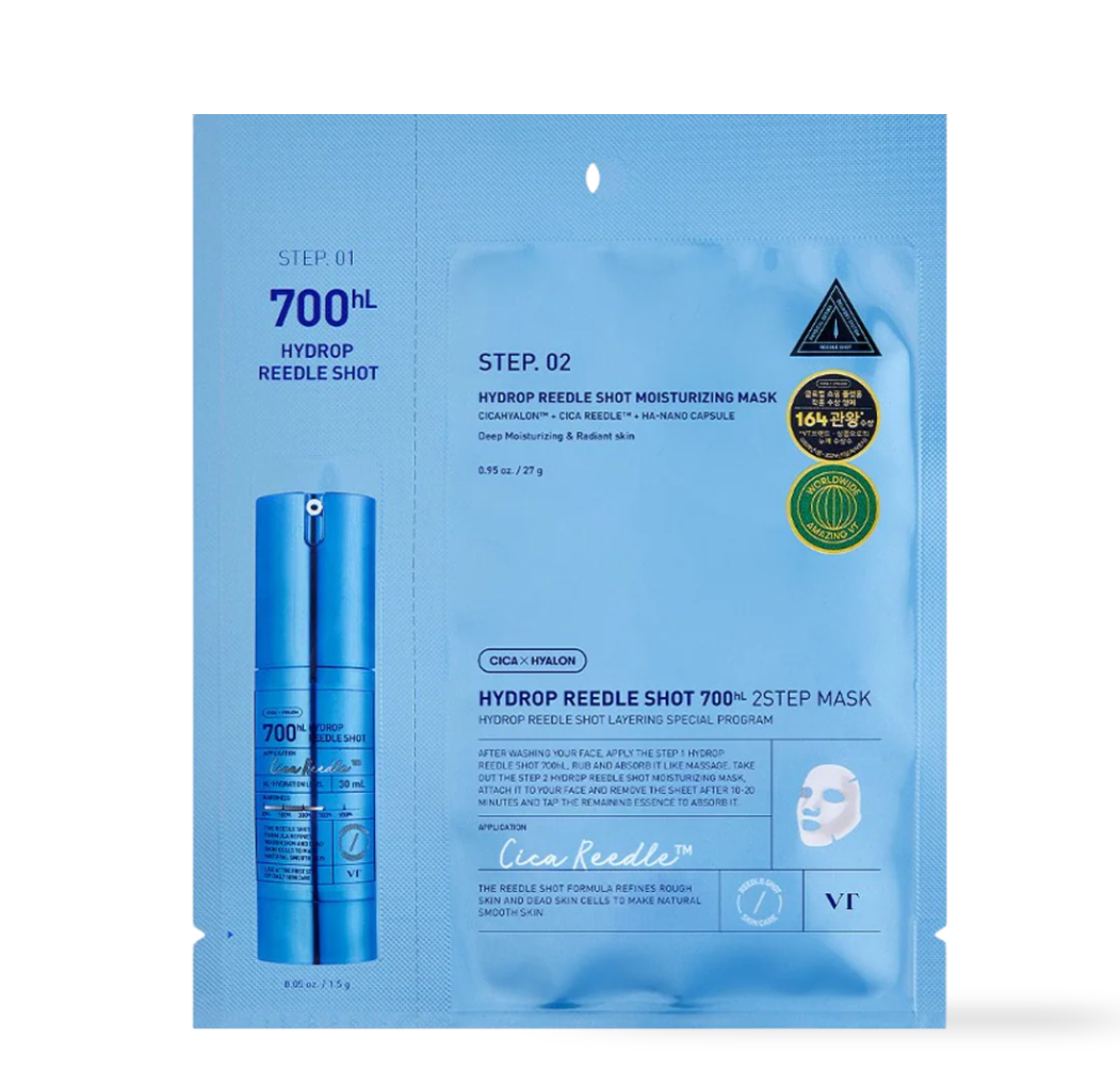 The VT Hydro Reedle Shot 2-Step Mask delivers intensive firming and hydrating care using VT’s innovative Reedle Shot technology. This advanced system helps active ingredients penetrate deeply into the skin for visible results. Step 1 features the Reedle Shot Ampoule (100HL, 300HL, or 700HL)—each level offering different intensity to suit your skin’s needs. Step 2 is a mask that locks in moisture, soothes irritation, and leaves the skin smooth, plump, and revitalized.